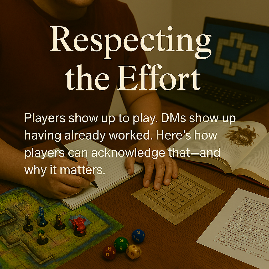 Players show up to play. DMs show up having already worked. That’s the truth. And while most players are grateful, it’s easy to underestimate just how much effort goes into making a session run smoothly. A player’s prep might take minutes. A DM’s prep takes hours. That gap deserves recognition.